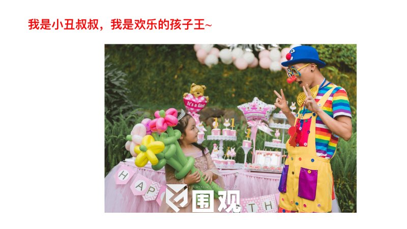 成都市优秀小丑表演演员、演出经历1000+、与众多杰出的演艺界人员、一起参与演出。温暖欢快的现场、热闹的氛围、丰富的人气。和大小朋友们、一起度过美好的时光、营造幸福欢乐的时刻。是快乐的孩子王、也是神奇魔法师。