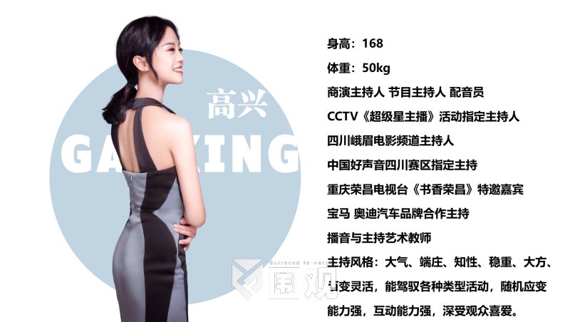 大气、端庄、知性、稳重、大方、 百变灵活,能驾驭各种类型活动,随机应变 能力强,互动能力强,深受观众喜爱。
