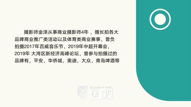 2015开始做专职摄影师,涉及行业包括婚纱、写真、儿童、摄影,品牌活动公关摄影