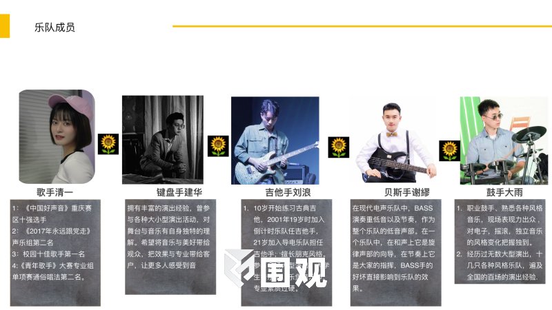 向日葵乐队创始于2018年六月,承接各种商业演出,商场开业,寿宴,宝宝宴等各种演出,演出经验丰富。擅长民谣,爵士,摇滚,嘻哈,流行等各种风格 。