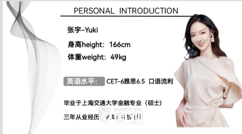 上海交通大学金融硕士,双语主持,CET-6,雅思6.5,从业3年,主持百场,包括:品牌发布会,财经论坛,大型综艺晚会,直播活动,房地产活动