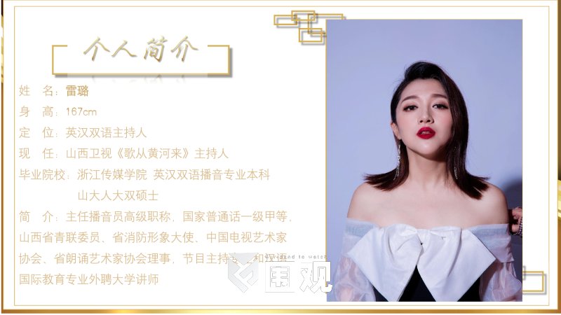 《歌从黄河来》《走进大戏台》《影像世界》《冲关大峡谷》《国乐大典》等,以及央视联袂打造的戏曲真人秀节目《寻找好声腔》、《为你而战》等主持,多次荣登央视星光奖颁奖舞台领奖并代表山西发声。
