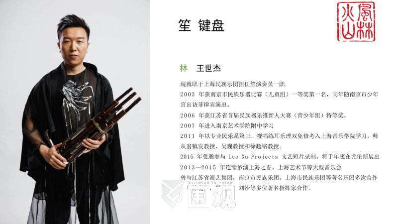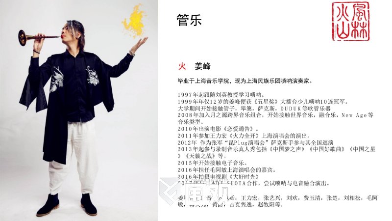 风林火山融合乐团以演奏EDM、 Fusion、Trap、 New Age、Sou等音乐风格见长。致力于将传统民族乐器与当下都市生活融合,通过创造出更多种类表现形式的Lve音乐,试着改变音乐爱好者固有的音乐审美,让更多年轻人了解并喜爱上民族音乐