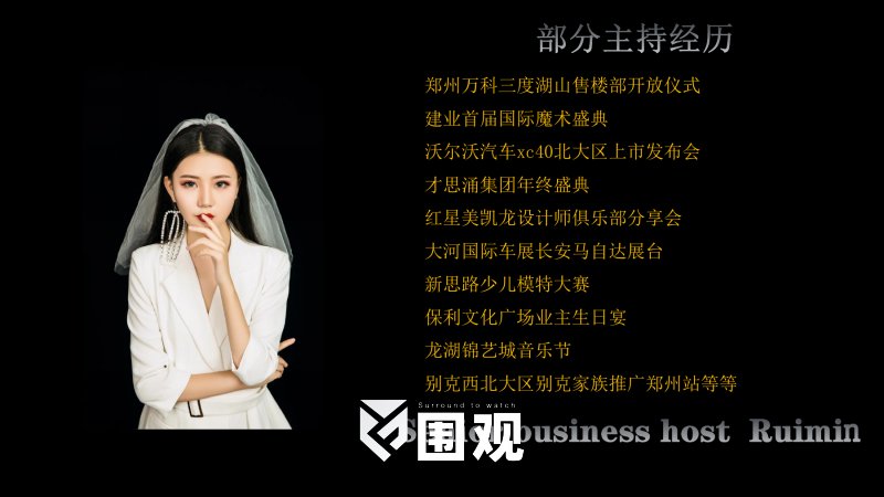 河南广播电视台梨园频道主持人 凭借亲切自然,端庄大方得体,稳重又不失灵动活力,声音极具辨识度,平易近人,救场能力强。严谨缜思维逻辑,灵活应变能力,可根据不同场景变换主持风格。 热情奔放,活力四射。超强的临场应变能力以及细致入微的工作态度深受品牌方,活动方等合作伙伴喜爱。