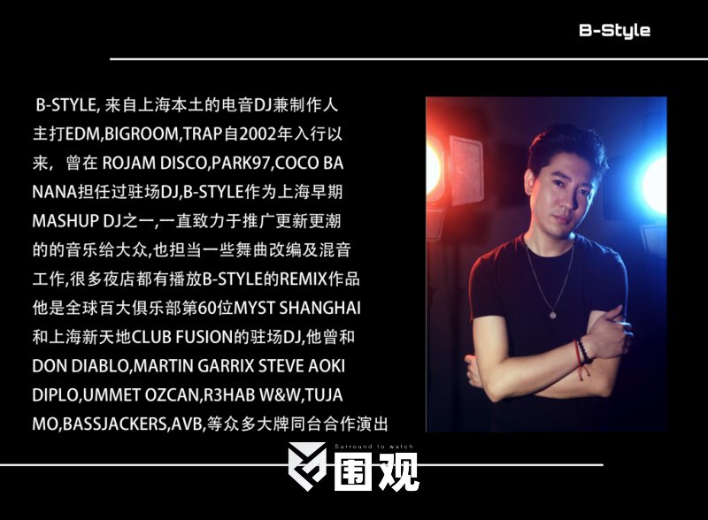 B-STYLE作为上海早期MASHUP DJ之一,一直致力于推广更新更潮的的音乐给大众,也担当一些舞曲改编及混音工作,很多夜店都有播放B-STYLE的REMIX作品他是全球百大俱乐部第60位MYSTSHANGHA和上海新天地CLUB FUSION的驻场DJ,他曾和DON DIABLO,MARTIN GARRIX STEVE AOK