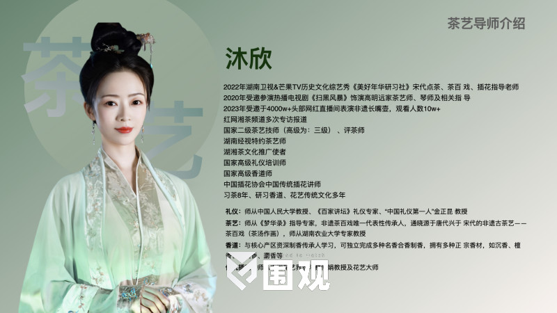 · 茶艺:师从《梦华录》指导专家,非遗茶百戏唯一代表性传承人,通晓源于唐代兴于