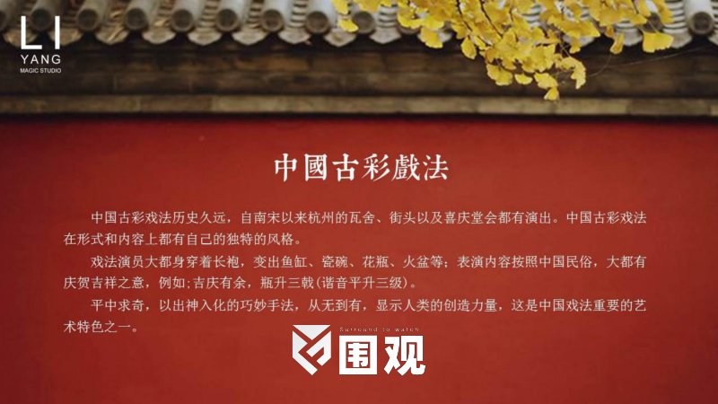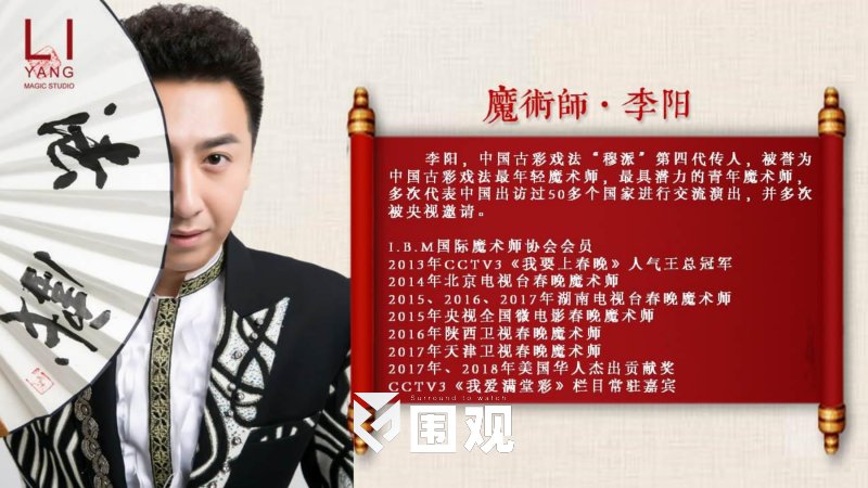 李阳中国古彩戏法“穆派”第四代传人,被誉为中国古彩戏法最年轻魔术师,最具潜力的青年魔术师,多次代表中国出访过50多个国家进行交流演出,并多次被央视邀请。