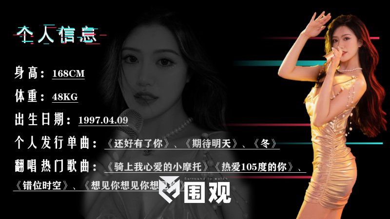 个人发行单曲:《还好有了你》、《期待明天》、《冬》 翻唱热门歌曲:《骑上我心爱的小摩托》《热爱105度的你》、 《错位时空》、《想见你想见你想见你》