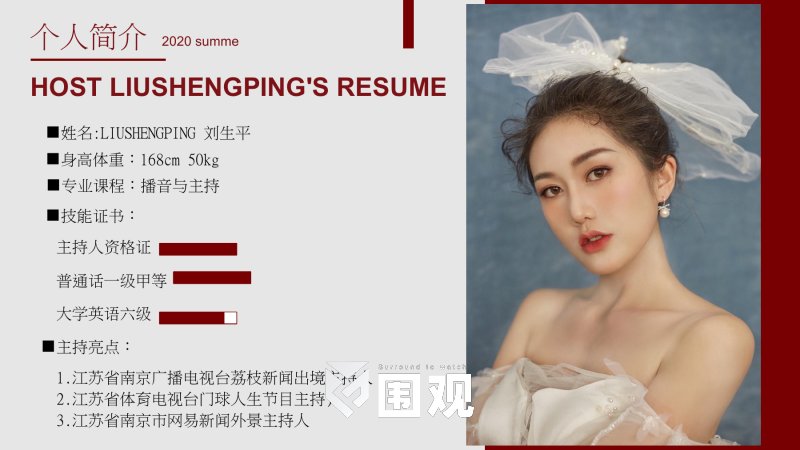 1.江苏省南京广播电视台荔枝新闻出境主持人 2.江苏省体育电视台门球人生节目主持) 3.江苏省南京市网易新闻外景主持人