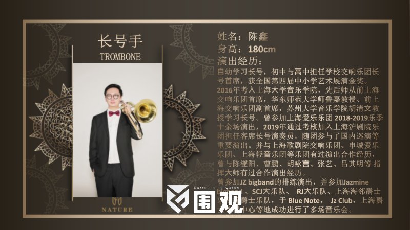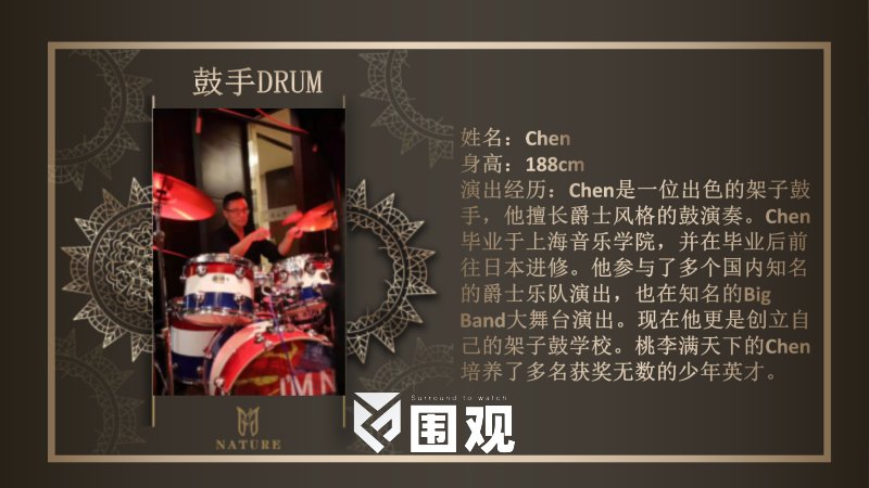 乐队常驻成员有复古高雅的女歌手JNGLE、中外萨克斯手、键盘手、吉他手、鼓手、低音提琴手、长号手。我们可以在乐队里添加小提琴、大提琴等乐器