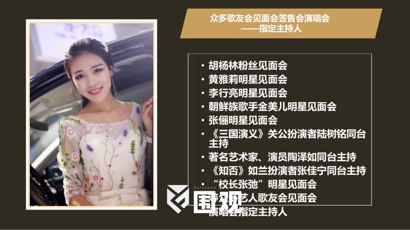 主 持 风 格:可亲和十足、可端庄大气、可性感幽默、不同舞台机智应变、掌控全场