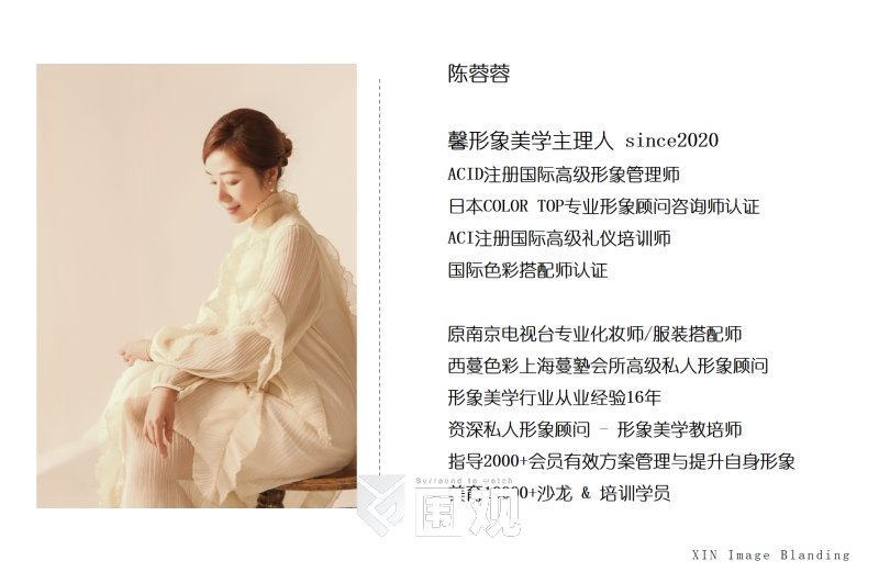 原南京电视台专业化妆师/服装搭配师西蔓色彩上海蔓塾会所高级私人形象顾问形象美学行业从业经验16年资深私人形象顾问 - 形象美学教培师指导2000+会员有效方案管理与提升自身形象美育10000+沙龙 & 培训学员