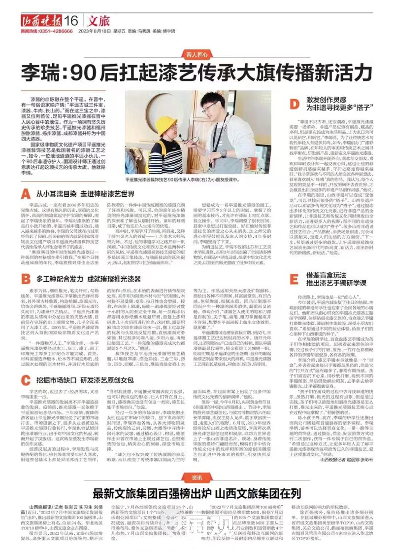 2023年8月刊登《山西晚报一李瑞:90后扛起漆艺传承大旗传播活力》
