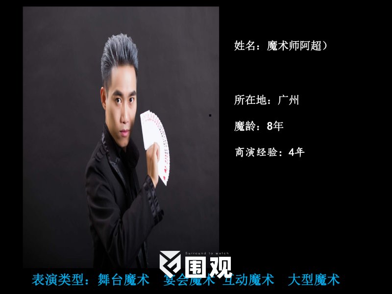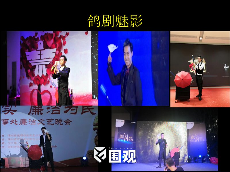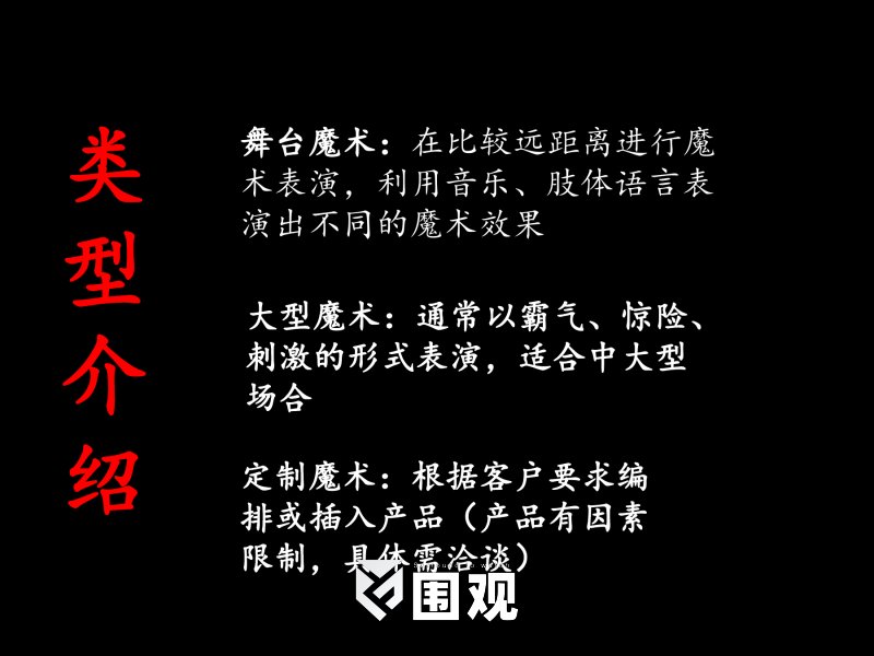 舞台魔术:在比较远距离进行魔术表演,利用音乐、肢体语言表演出不同的魔术效果 大型魔术:通常以霸气、惊险、刺激的形式表演,适合中大型场合 定制魔术:根据客户要求编排或插入产品(产品有因素限制,具体需洽谈)