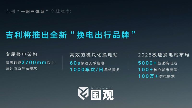 同时,吉利在“换电架构、换电站、换电车辆”领域已经拥有上千项技术专利,并参与了国家换电标准的制定。基于专属换电架构,吉利还将推出全新“换电出行品牌”。到2025年,实现100个核心城市布局5000座极速换电站,满足100万辆车的换电需求。