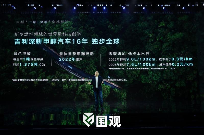 值得一提的是,吉利在新型燃料领域深耕甲醇汽车16年,已经在甲醇能源领域独步全球,拥有核心技术专利200余件,在西安、晋中、贵阳等多地规模化运行2.7万辆,总运行里程达到80亿公里。2022年,吉利将推出“雷神智擎甲醇混动“车型,百公里醇耗在9L左右,醇耗降幅超40%,每公里的出行成本低于三毛钱。到2025年,百公里醇耗将降到7.6L,相当于百公里油耗3.5L,每公里的出行成本两毛钱,生命周期内零碳增加,更环保。