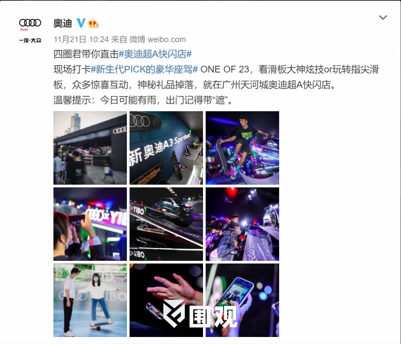 现场打卡#新生代PICK的豪华座驾# ONE OF 23,看滑板大神炫技or玩转指尖滑板,众多惊喜互动,神秘礼品掉落,就在广州天河城奥迪超A快闪店。