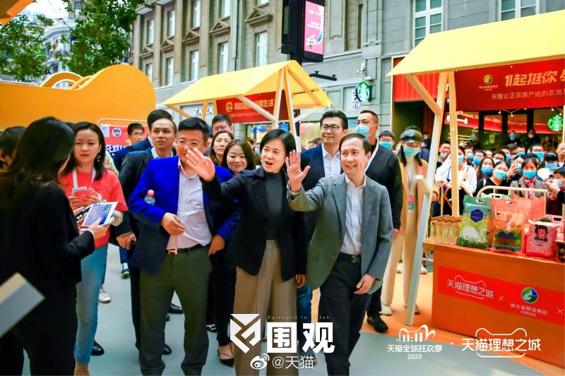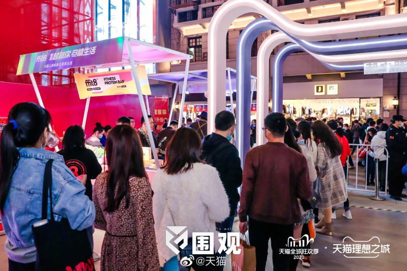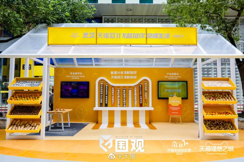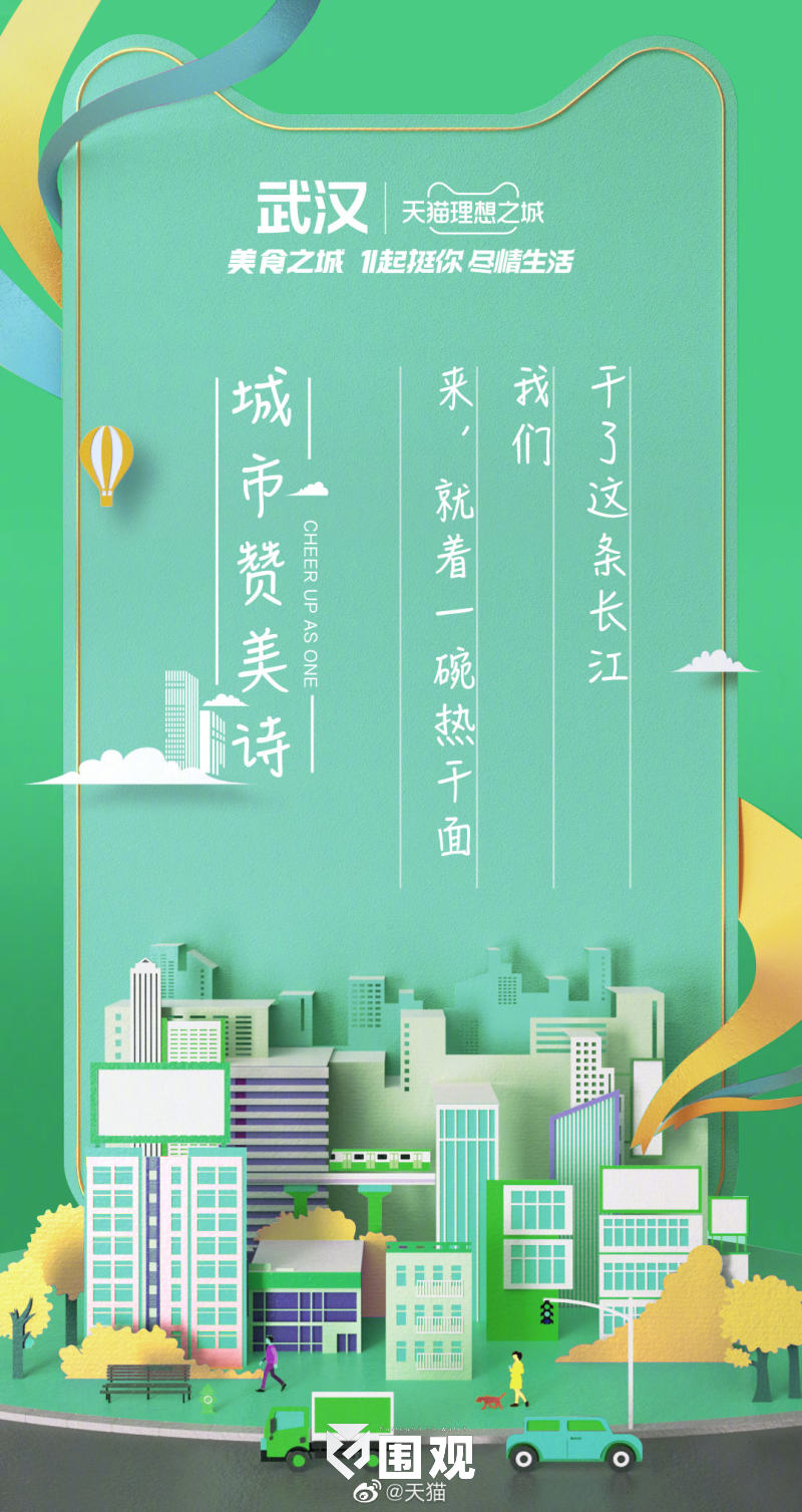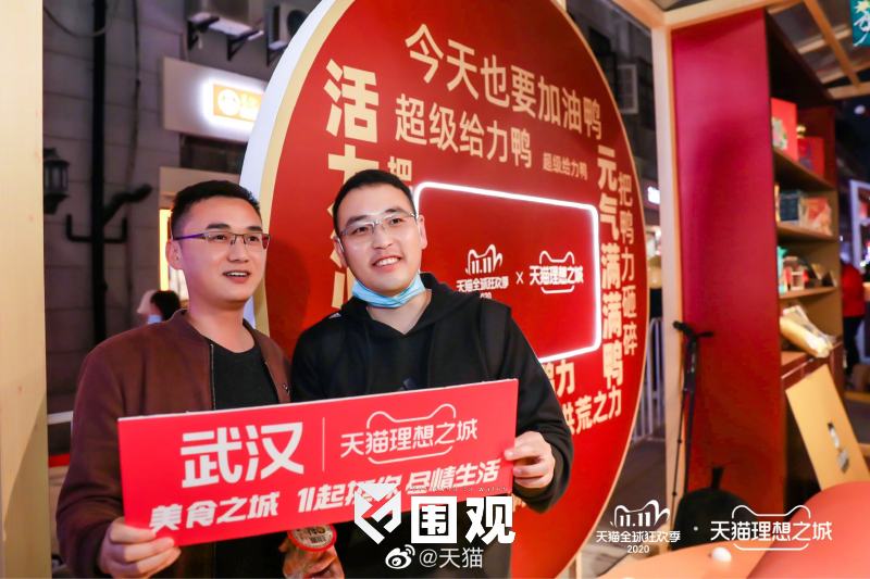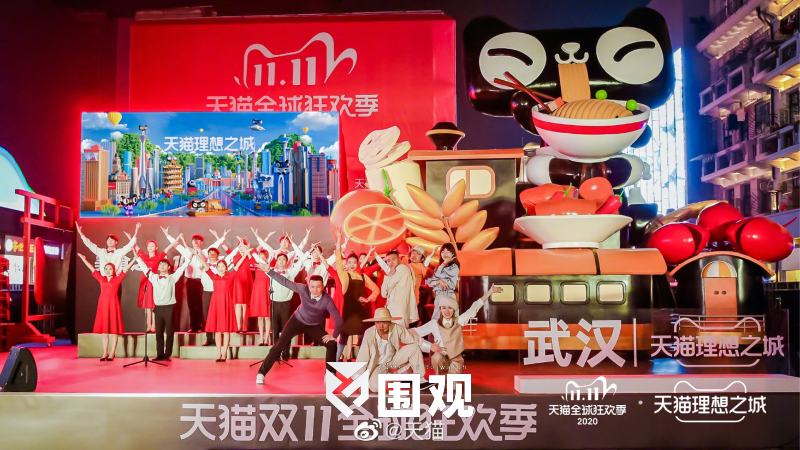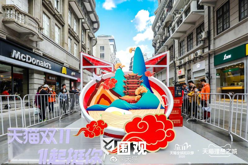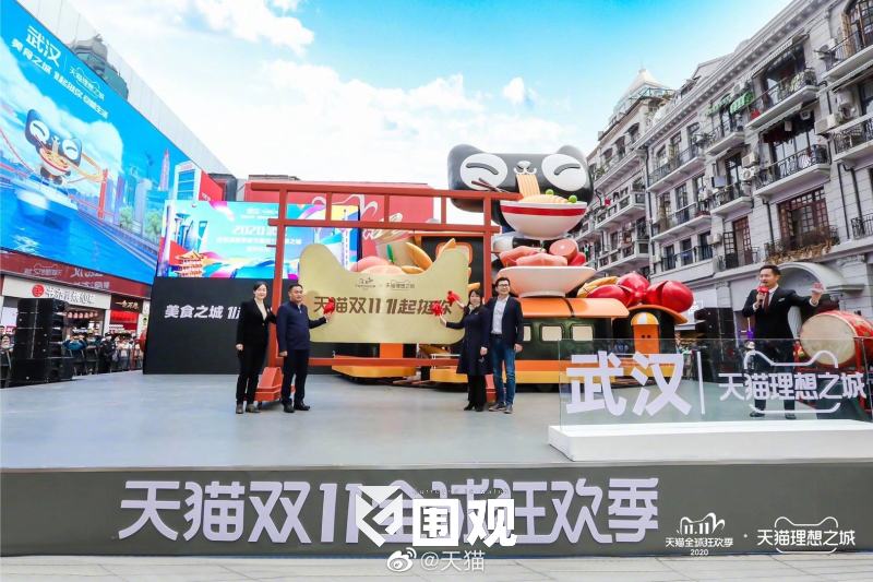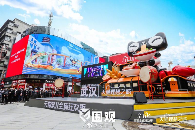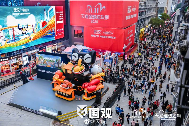 昔日八方驰援,今日大宴天下;大美荆楚,味来可期——#天猫理想之城#11月1日在武汉开城,江汉路步行街璇宫广场中央出现了吃着热干面的巨型天猫
