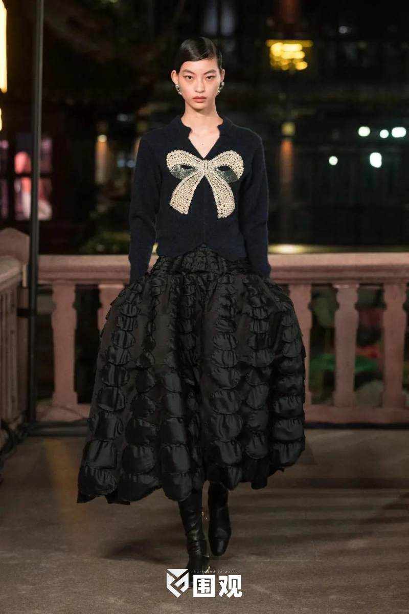 历史悠久的九曲桥湖心亭摇身一变成为光影交错的沉浸式T台,九曲桥原汁原味地保留着始于乾隆年间的结构和痕迹。当四周的灯光熄灭后,湖心亭的灯光秀华丽登场,混杂着蓝色和紫色灯光的湖心亭将整个九心桥区域笼罩为一个「封闭式舞台」,品鉴中和西,古与今的交汇。