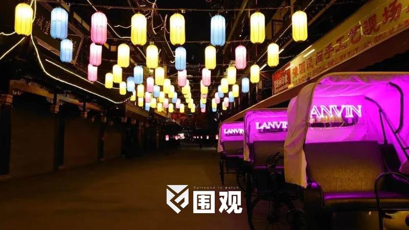豫园商城的街区式广场、巷弄以及高空区域悉数开放,在豫园传统的非遗千灯及三维激光秀的印衬下,光影交错。秀场内随处可见的中式元素如:荷花池、灯笼、牌匾、观音雕像等,与LANVIN的法式浪漫碰撞出了不一样的视觉火花。