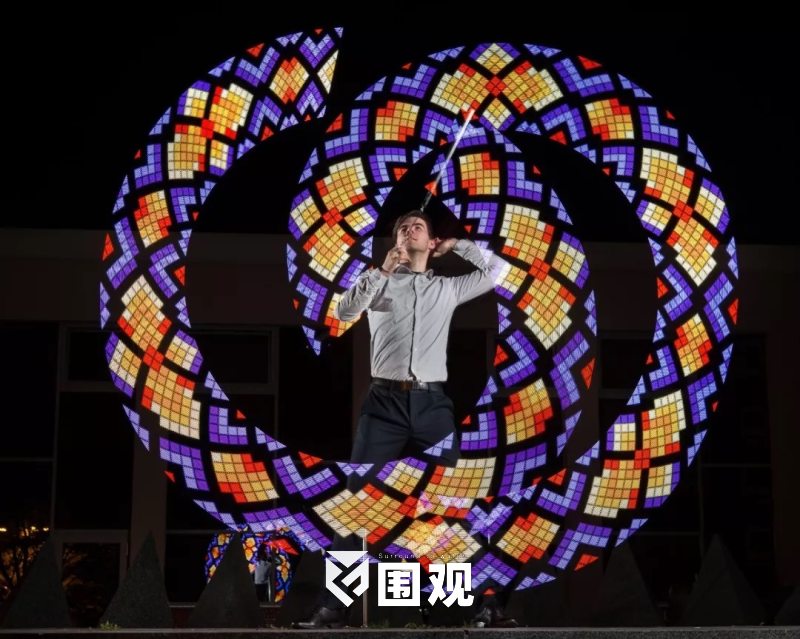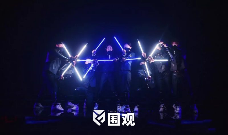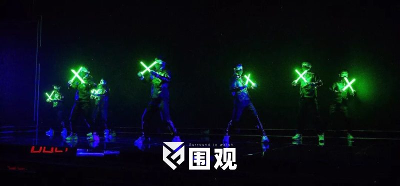 利用可编程高科技流光棒与舞蹈矩阵互动,带来全新的视觉体验。此次表演采用的小棒,可以实现轮转过程在空中高分辨率显示定制的图文甚至动画效果,同时所有小棒均可实现毫秒级无线控制,并可与控台实现声光电的完全同步