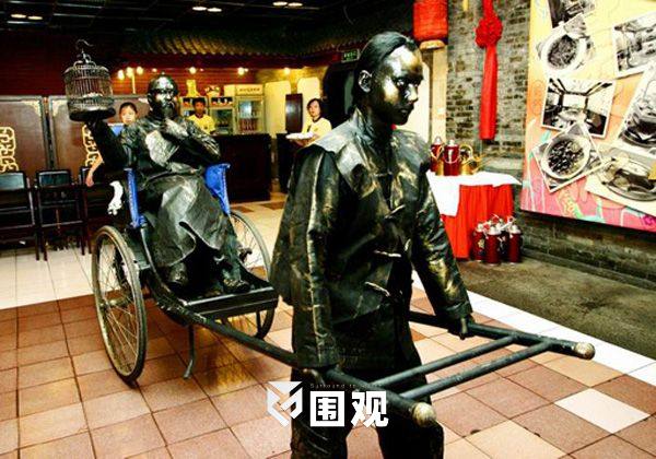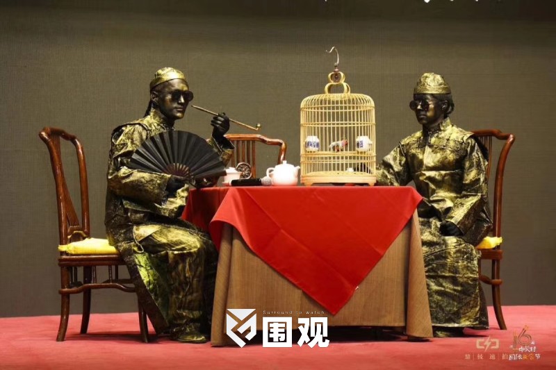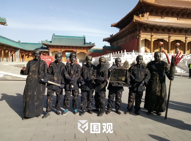 演员们身着传统中式长袍、马褂、布鞋等服饰,通过在裸露的皮肤和衣服上涂满黄铜色的颜料,将自己装扮成铜制雕塑的样子,形象逼真地还原出老北京时期的各类人物形象;如同真正的铜人雕塑一般,一动不动地展示老北京人物的典型姿态,体现出雕塑的质感和艺术感,动静结合,给观众带来独特的视觉体验