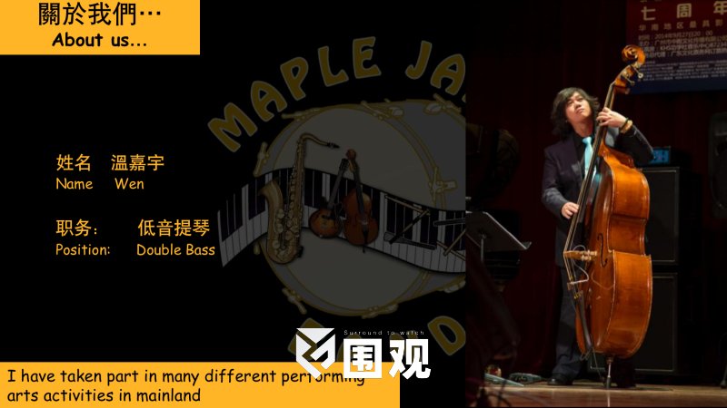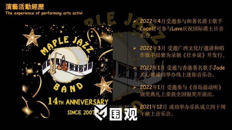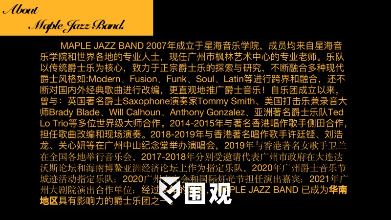 MAPLE JAZZ BAND 2007年成立于星海音乐学院,成员均来自星海音乐学院和世界各地的专业人士,现任广州市枫林艺术中心的专业老师。乐队以传统爵士乐为核心,致力于正宗爵士乐的探索与研究,不断融合多种现代爵士风格如:Modern、Fusion、Funk、Soul、Latin等进行跨界和融合,还不断对国内外经典歌曲进行改编,更直观地推广爵士音乐!自乐团成立以来,曾与:英国著名爵士Saxophone演奏家Tommy Smith、美国打击乐兼录音大师Brady Blade、Will Calhoun、Anthony Gonzalez、亚洲著名爵士乐队Ted Lo Trio等多位世界级大师合作。2014-2015年与著名香港唱作歌手侧田合作,担任歌曲改编和现场演奏。2018-2019年与香港著名唱作歌手许廷铿、刘浩龙、关心妍等在广州中山纪念堂举办演唱会,2019年与香港著名女歌手卫兰在全国各地举行音乐会。2017-2018年分别受邀请代表广州市政府在大连达沃斯论坛和海南博鳌亚洲经济论坛上作为指定乐队。2020年广州爵士音乐节城迹活动指定乐队;2020广州文交会和国际灯光节担任演出嘉宾;2021年广州大剧院演出合作单位;经过多年的发展,MAPLE JAZZ BAND 已成为华南地区具有影响力的爵士乐团之一。