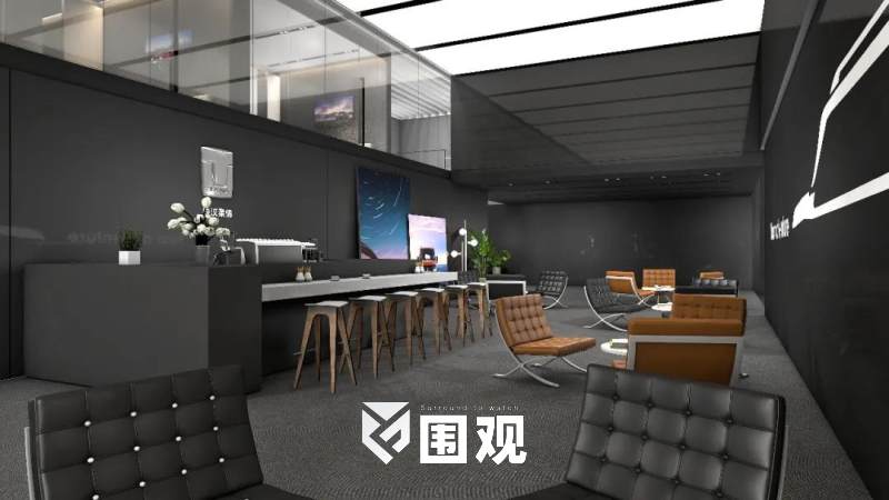 通透感钢结构“折角型”分布场地四角,构成四个独立的双层矩阵,为小型场景化提供空间。以黑白底色作为两个品牌的视觉区分,中间公用区域以灰色作为过渡。