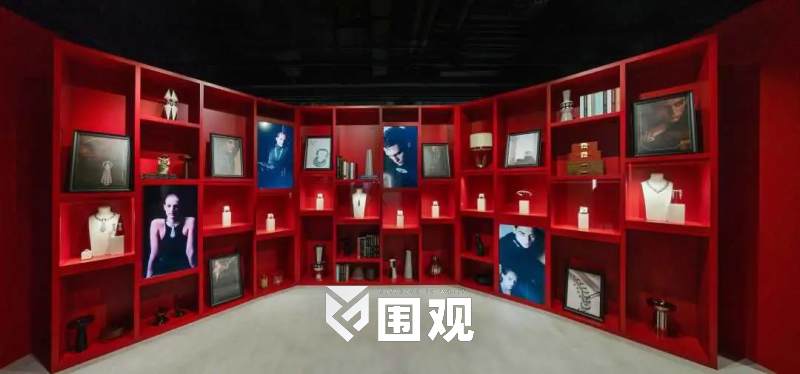 「世家传承」空间宛若一件图书馆,胭脂红的墙面涂饰充满了中国的东方风格,旨在向Salon Chinois致敬。四周更别出心裁的设置数字屏幕,持续播放着世家臻品的视频和图像。