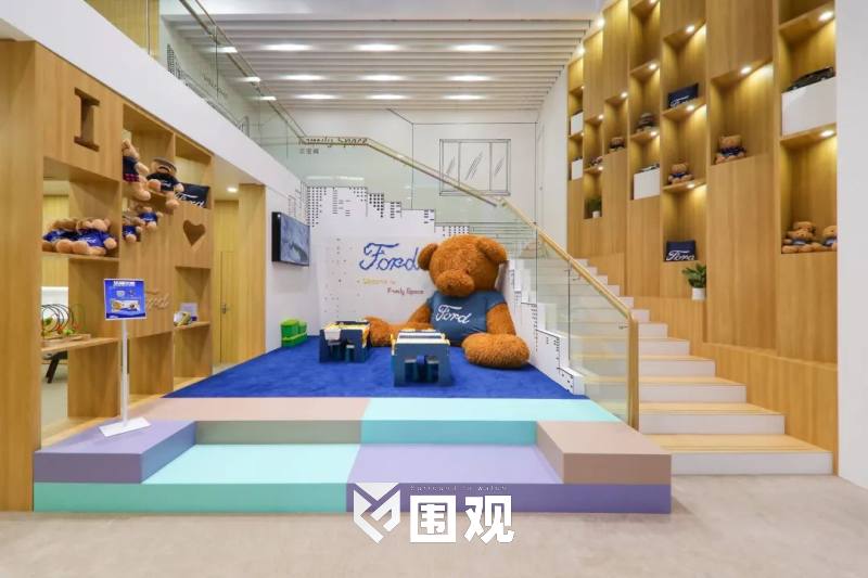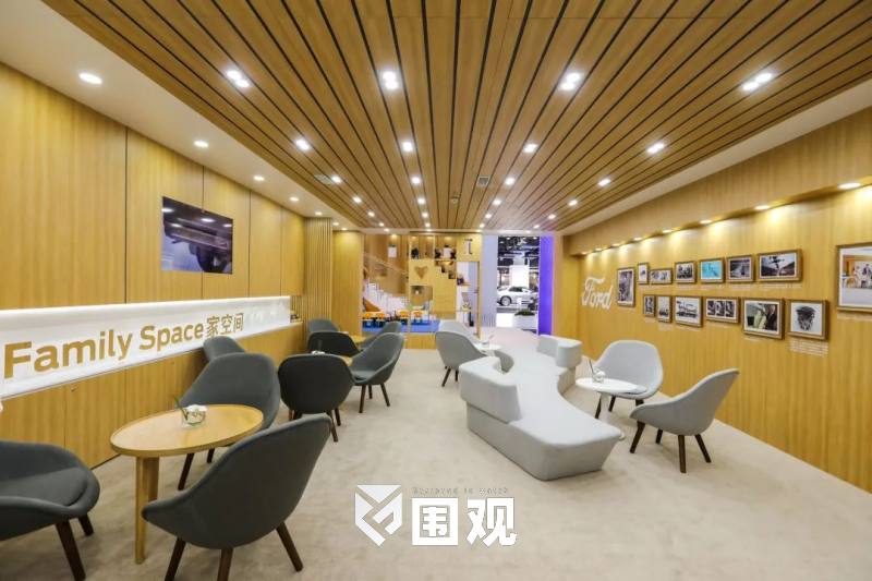 展台整体设计以 “乐享无限,就在 Family Space 家空间” 为主题,富有质感的木纹搭配福特蓝营造温馨快乐的氛围,设置福特萌熊打卡留影区,亲子乐高互动区,豪华客休区,让展台上每一位观众感受如家般的挚爱关怀。