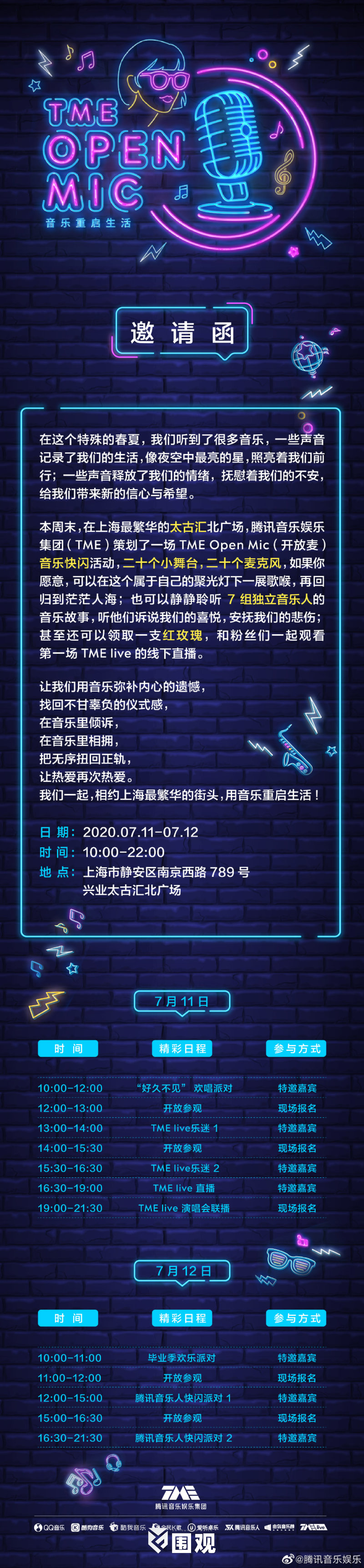 7.11-7.12,TME快闪店在上海太古汇等你打卡,二十个定制舞台,二十个麦克风还有众多独立音乐人和粉丝集合,让我们一起感受后疫情生活里的热情和烟火。