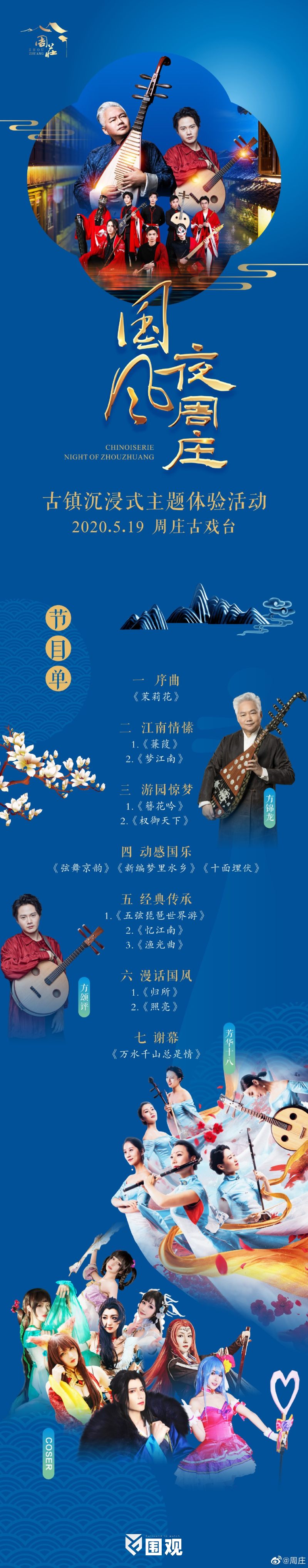 著名琵琶演奏家方锦龙、方颂评父子、芳华十八乐团、嗨的HiDii乐团等知名艺者都将亲临周庄 ,用婉转的国风曲调带你穿越回古代,一品周庄韵味。方锦龙先生被誉为国乐四大天王之一,是现代五弦琵琶的代表人物,生于一个弹拨乐世家,从小就耳濡目染喜欢上了民乐,早在方老师15岁时候,就已经掌握了十几种乐器的演奏,想当年,一首《春江花月夜》倾倒了万千观众。“国风夜周庄——古镇沉浸式主题体验活动”,将会带领观众穿越古今,神游中外,进行了一个跨界“融合”。