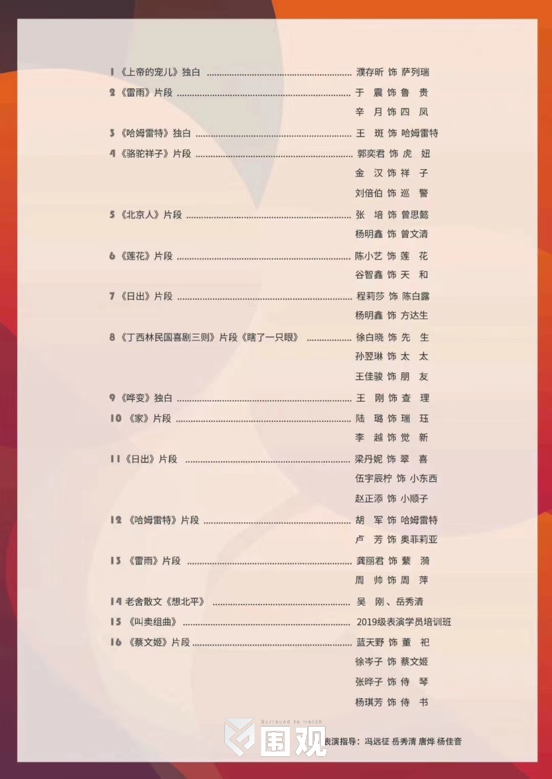 下半场上演的片段则是原版《日出》中分饰顾八奶奶和翠喜两个角色的梁丹妮带着两位入院不久的新人——伍宇辰柠、赵正添,表演该剧第三幕,带观众去看看翠喜与小东西的苦难境遇。《丁西林民国喜剧三则》是此次演出中唯一的一部小剧场话剧,由徐白晓、孙翌琳、王佳骏三位组成的原班阵容出演,短小机智又轻松幽默。《哗变》是当之无愧的“话剧姓话”的典范,由王刚带来的剧中查理独白,向观众展示了话剧台词的功底和语言的魅力。曹禺改编自巴金代表作的《家》,此番演出由两位十足的新面孔——李越和陆璐出演,在他们身上观众看到了人艺年轻一代对经典的态度。