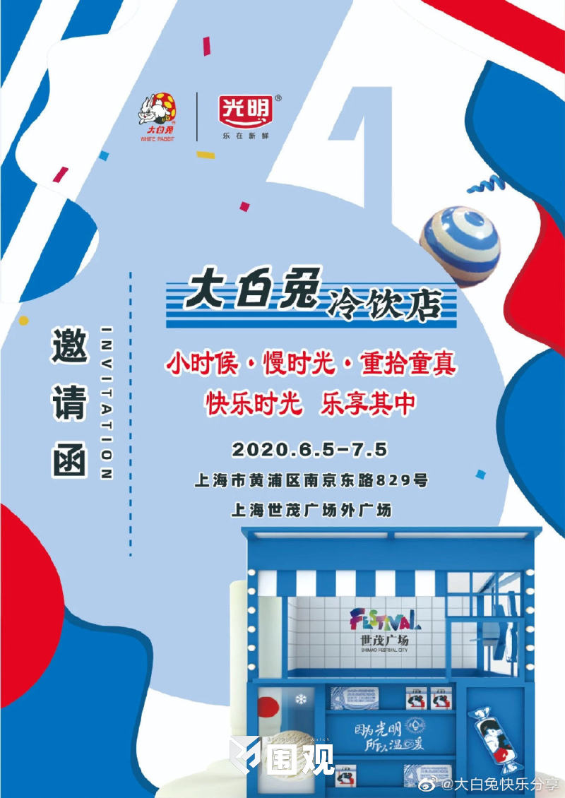 6月5日起,为期一个月的大白兔主题时光游乐园及大白兔冷饮店将在南京东路步行街起点位置的上海世茂广场亮相,与各界“潮人”分享大白兔的冰爽甜蜜滋味,唤醒童年记忆,并带来多重互动潮趣体验。