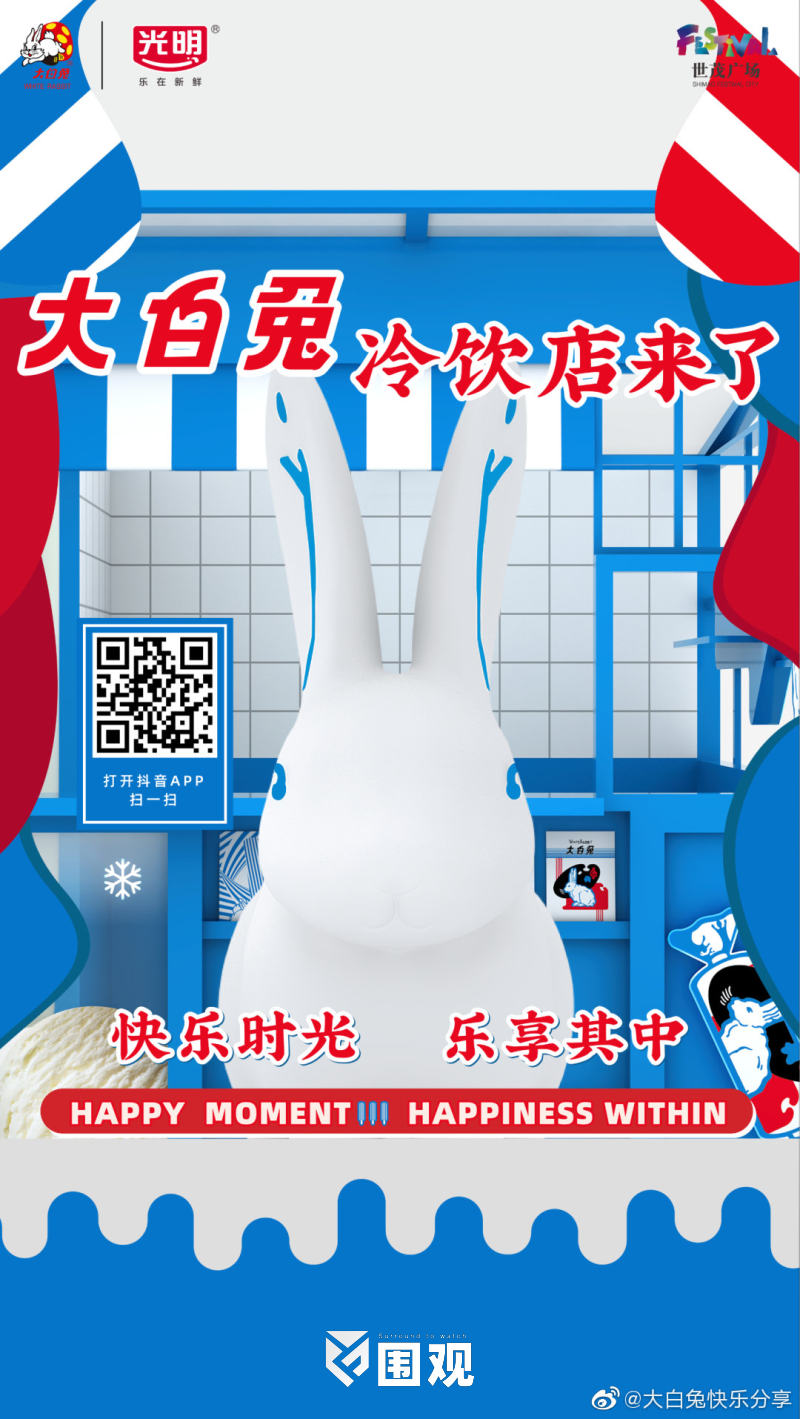 此次由冠生园食品“大白兔”品牌携手光明乳业“光明”品牌打造的大白兔时光游乐园落地上海世茂广场,以大白兔和雪糕元素为灵感,带来别具新意的“大白兔冷饮店”和售卖大白兔周边文创产品的“大白兔快闪店”。此外,乐园还将为消费者带来巨型雪糕棍、大白兔盲抽机、大白兔快闪店、大白兔互动区、冰淇淋互动拍照区等七大互动体验,为年轻人讲述老品牌的新故事。