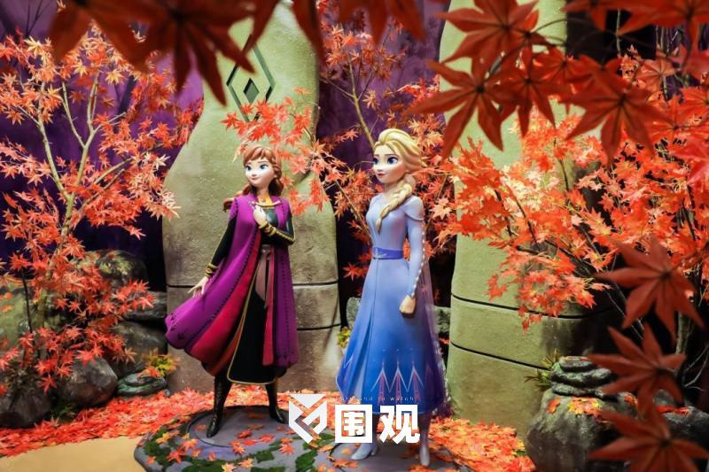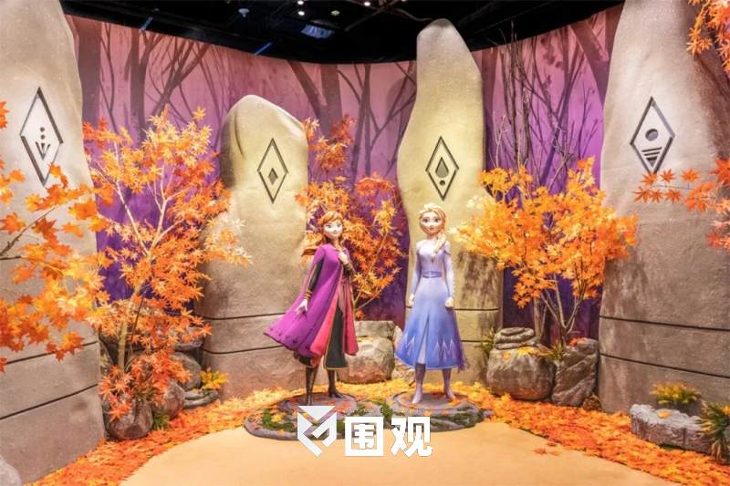 到了《冰雪奇缘2》展区,《寻找未知真相》的音乐随即响起来,带你走进姐妹俩勇敢再出发找寻自我的情境里。魔法之境入口,巨石高耸如云,艾莎女王和安娜公主因为彼此陪伴,神情坚定。