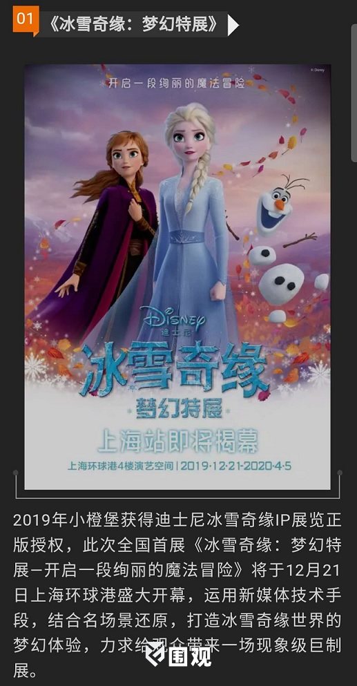 2019年12月21日至2020年04月05日,迪士尼正版授权“冰雪奇缘:梦幻特展”降临上海环球港4层的演艺空间。展览通过九大电影经典重现区和九大高科技魔法互动体验,为大众开启一场全新的、高科技的、奇幻的沉浸式“魔法冒险之旅”。