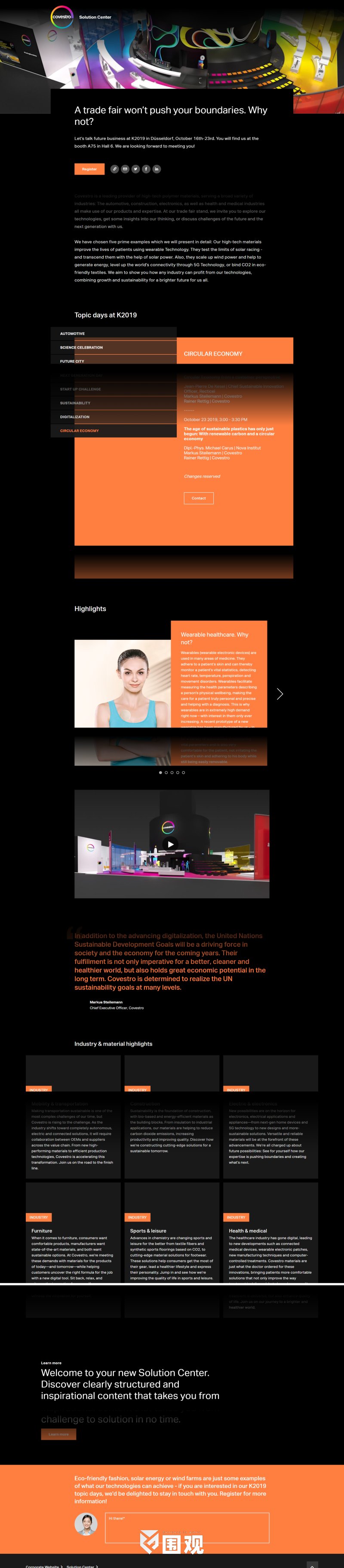 科思创是高科技聚合物材料的领先供应商,为广泛的行业提供服务:汽车,建筑,电子,健康和医疗行业都利用我们的产品和专业知识。在我们的展会摊位上,我们邀请您探索我们的技术,对我们的思维有一些了解,或者与我们讨论未来和下一代的挑战。