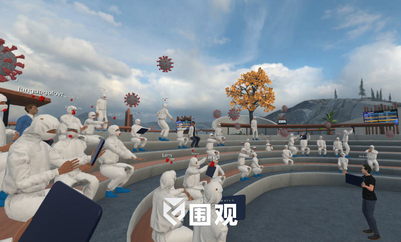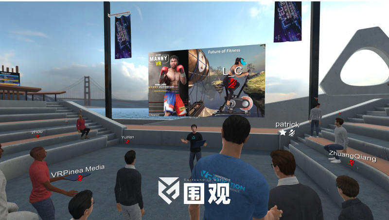 在《Engage》虚拟世界中,一个风景宜人的海岛上,除了露天会场外,还有一个娱乐大堂可以打篮球、下飞行棋、玩VIVEPORT设备上的VR游戏。