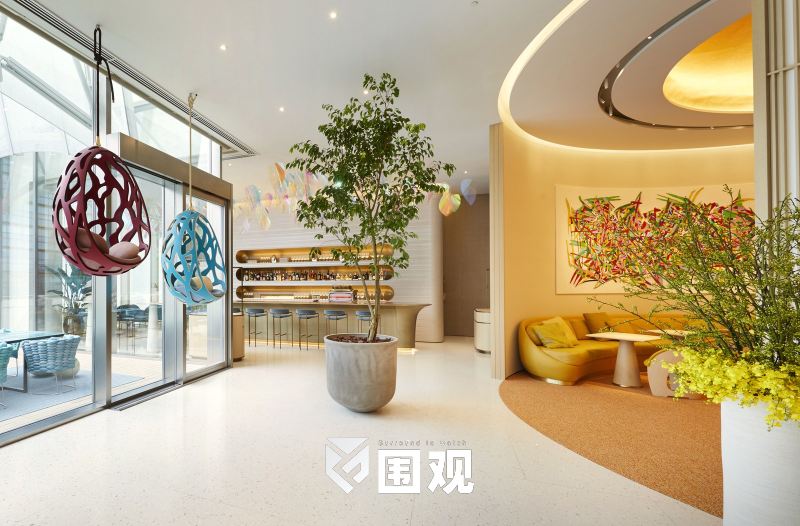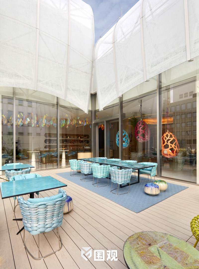 Le Café V. 的内部。悬挂在天花板上的是 Estudio Campaña的茧椅,这是Louis Vuittion的Objets Nomades系列的一部分。