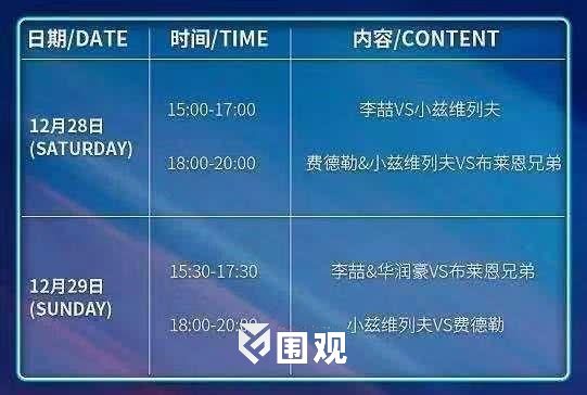 3 2019年12月28日晚间,费德勒将搭档兹维列夫,在双打赛场对阵布莱恩兄弟。 2019年12月29日晚间,则是费德勒与兹维列夫间的强强对话。