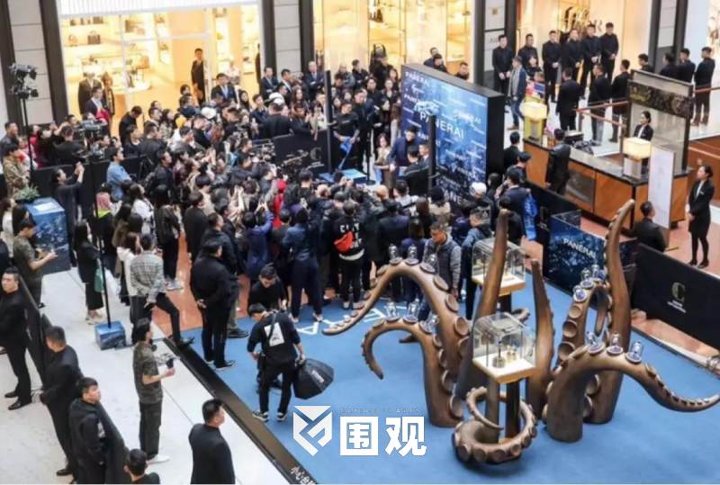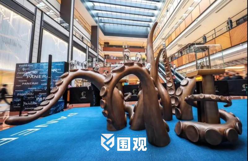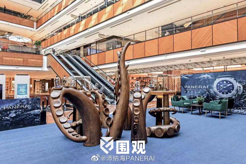 在别出心裁的巨型章鱼触角展柜上陈列着一系列沛纳海经典腕表作品。