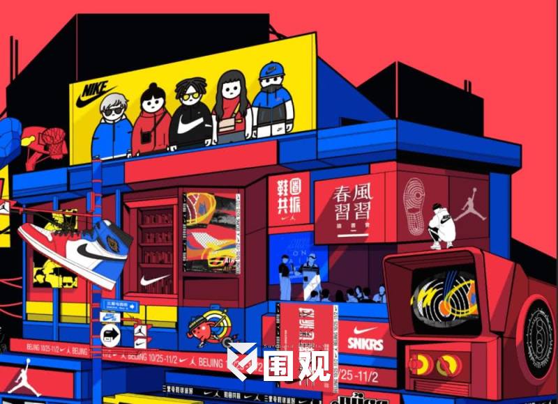整个社区以活动主视觉相匹配的红黄蓝色调为主进行设计和构建,让你一秒置身NIKE的球鞋世界。