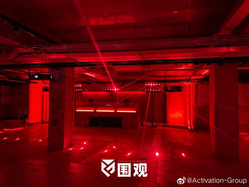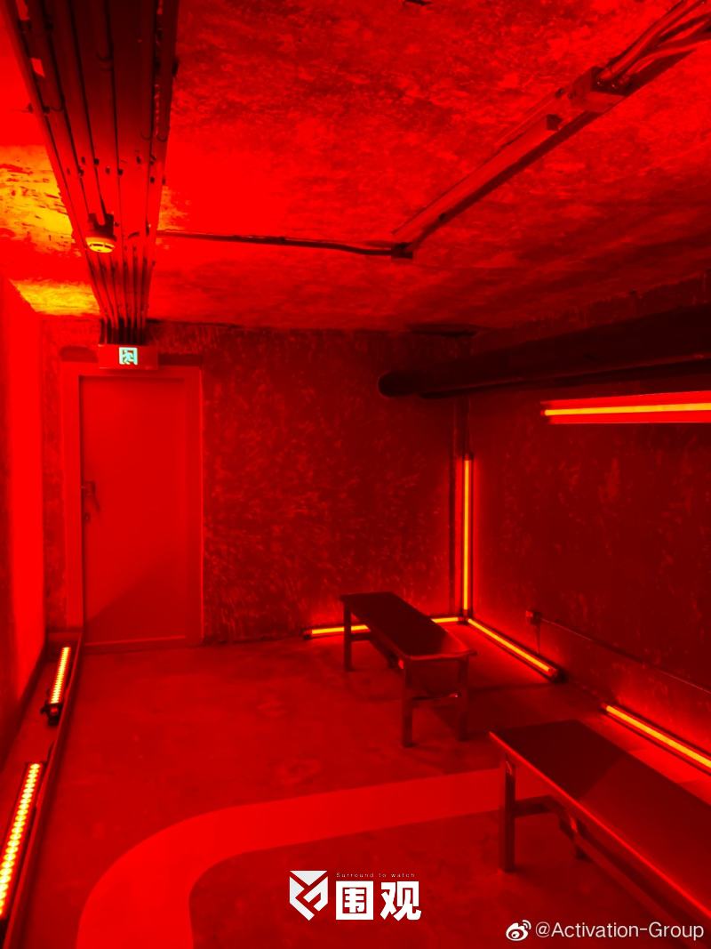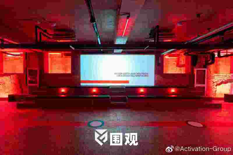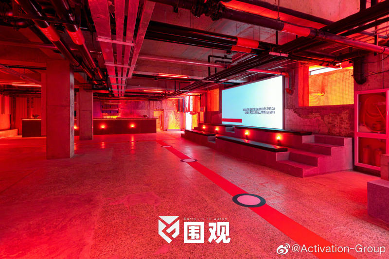 派对现场整体设计以Prada LineaRossa红线为灵感,醒目的细长红色标识纵贯空间。