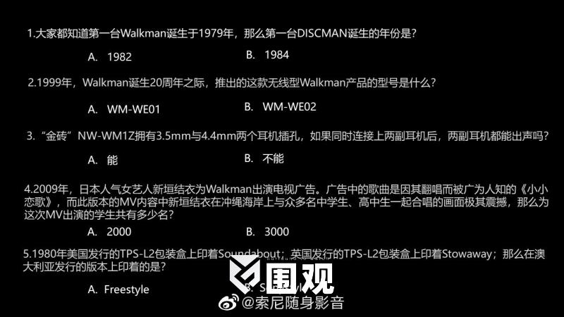 现场游戏环节,准备一些与Walkman相关的问题,均只有A、B两个选项,现场粉丝全部站立,每轮答错的参与者将坐下并失去之后的答题权,谁能成为一站到底的Walkman“站”神?