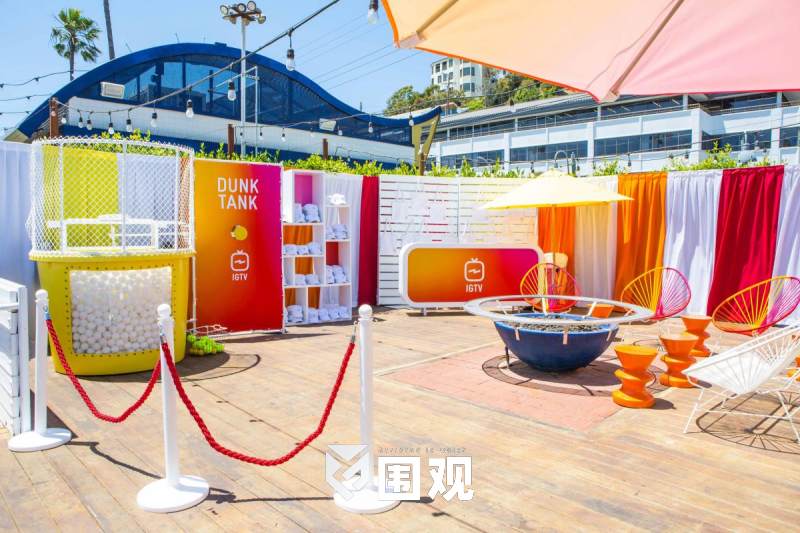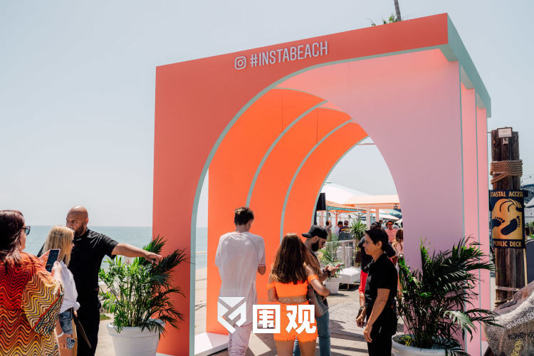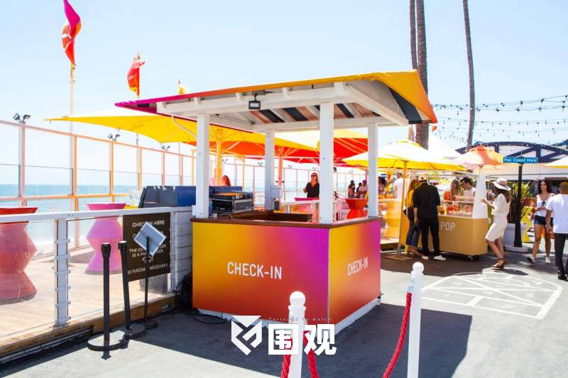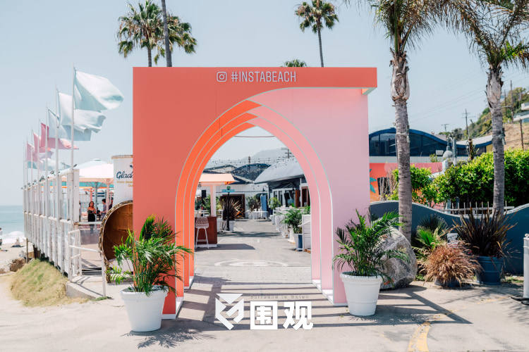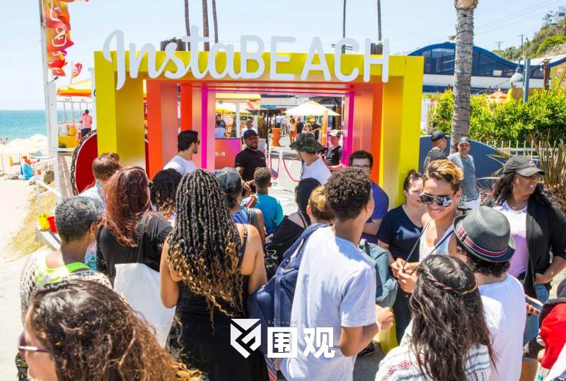 Instabeach项目的灵感来源于加州海滩主题的嘉年华,该主题通过Insta价值观(Insta-worthy)丰富多彩的元素贯穿整个活动,比如入口处的隧道空间、阳光下的秋千区域、气球空间、Instagram灌篮和Giant Hi-Striker游戏。