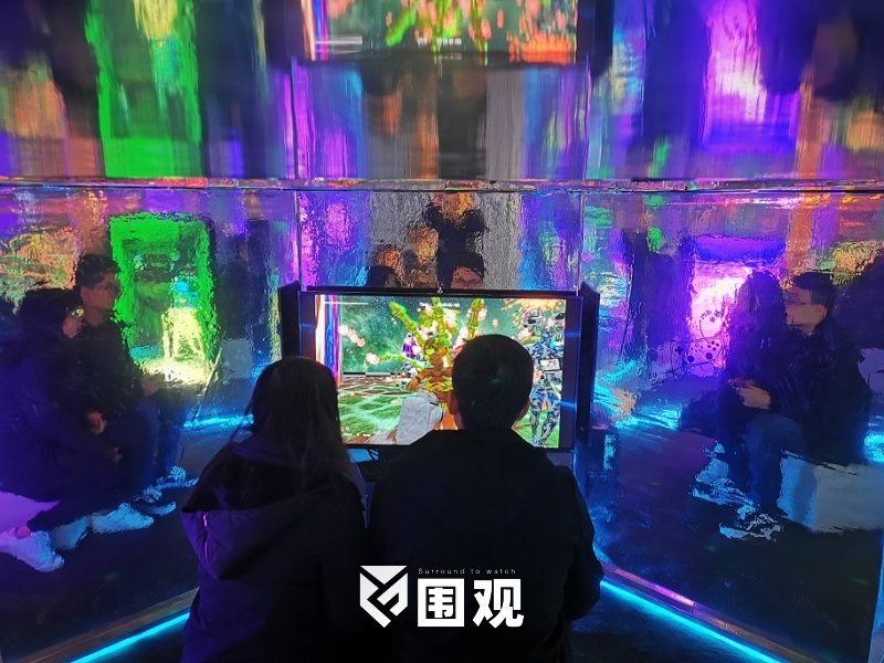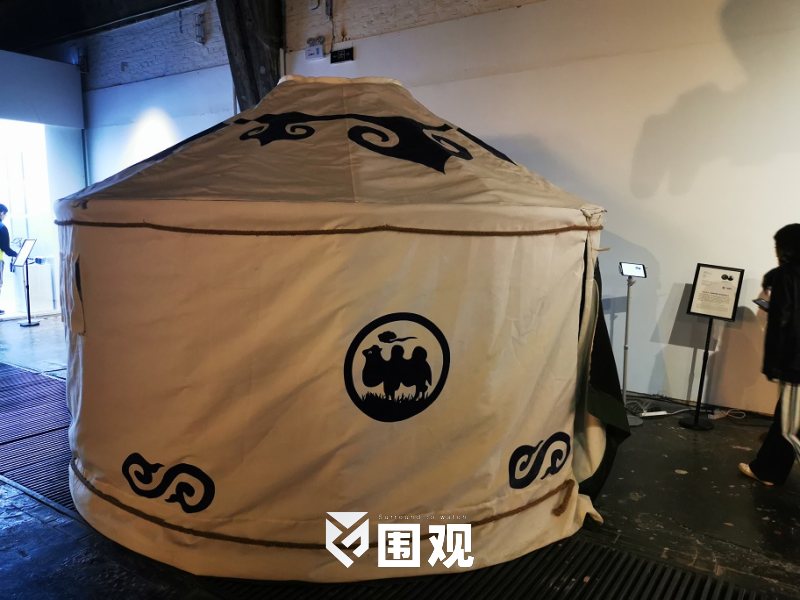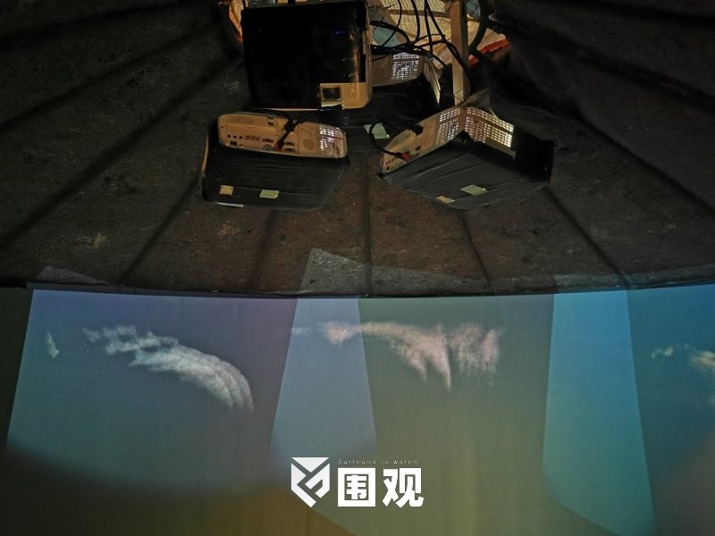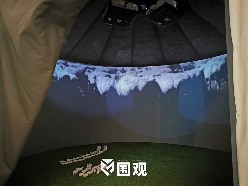 蒙古包内部有乾坤,顶部是两台投影机画面拼接展示羊群在蒙古包内部地面是羊群在草原上