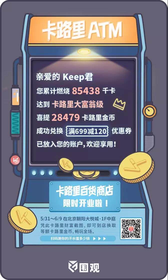 从“Keep 商城”小程序进入 “Keep 商城”小程序后,店中的「卡路里 ATM」将会自动读取你的 Keep KG 等级和累计燃烧的卡路里总数,并将这些努力兑换成不同配比的优惠券和卡路里金币。优惠券将用于线上商店各类趣味专柜的好物购买,而卡路里金币则作为线下「卡路里百货商店」唯一的通用货币,帮助你在之后线下趣味体验中解锁闯关。