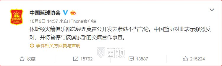 火箭队总经理莫雷发了带有支持港独言论推特,以上为来自“中国篮球协会”的信息