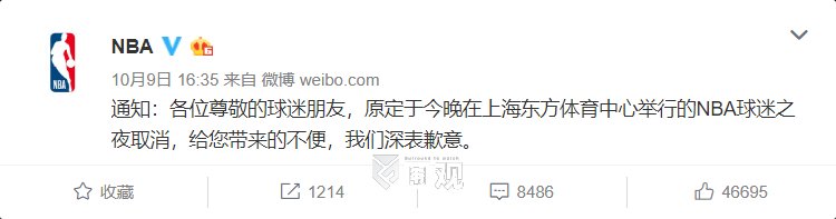 百视通也暂停了NBA季前赛(中国赛)的转播安排,立即排查涉及NBA的一切合作交流。